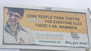 Was the viewer wanting to be perfect?  Were we supposed to feel comfortable and trusting of Dr. Warnock? Was this guy on the billboard Dr. Warnock who was excited about operating on us?
